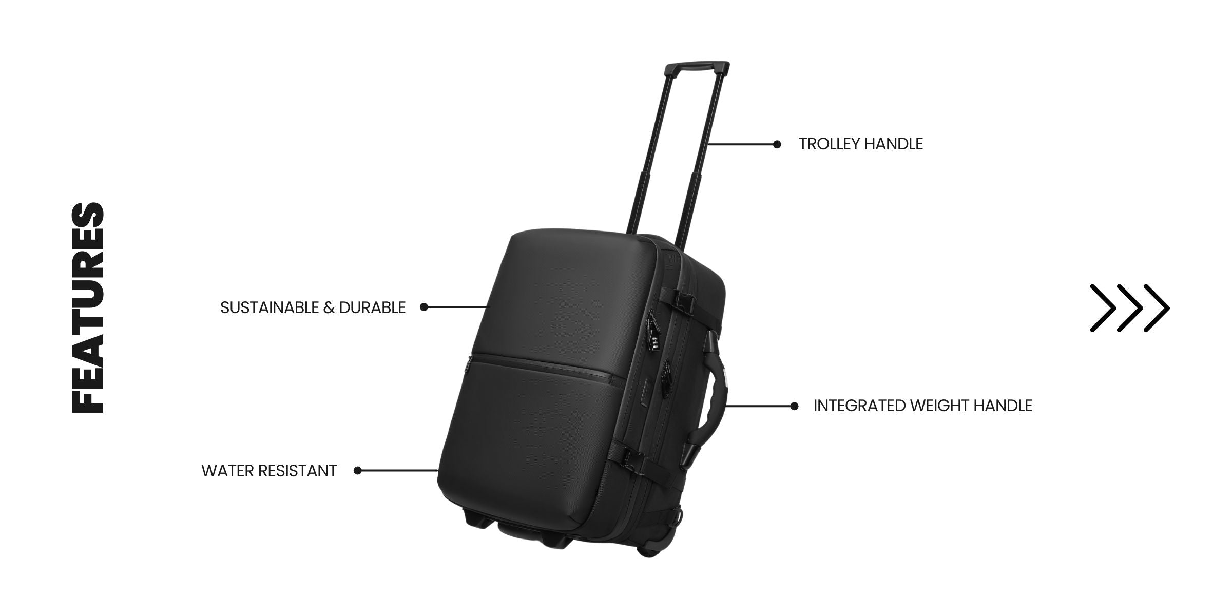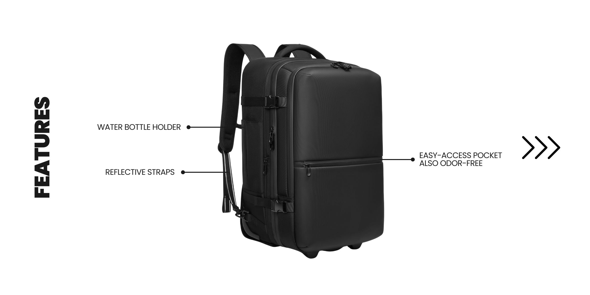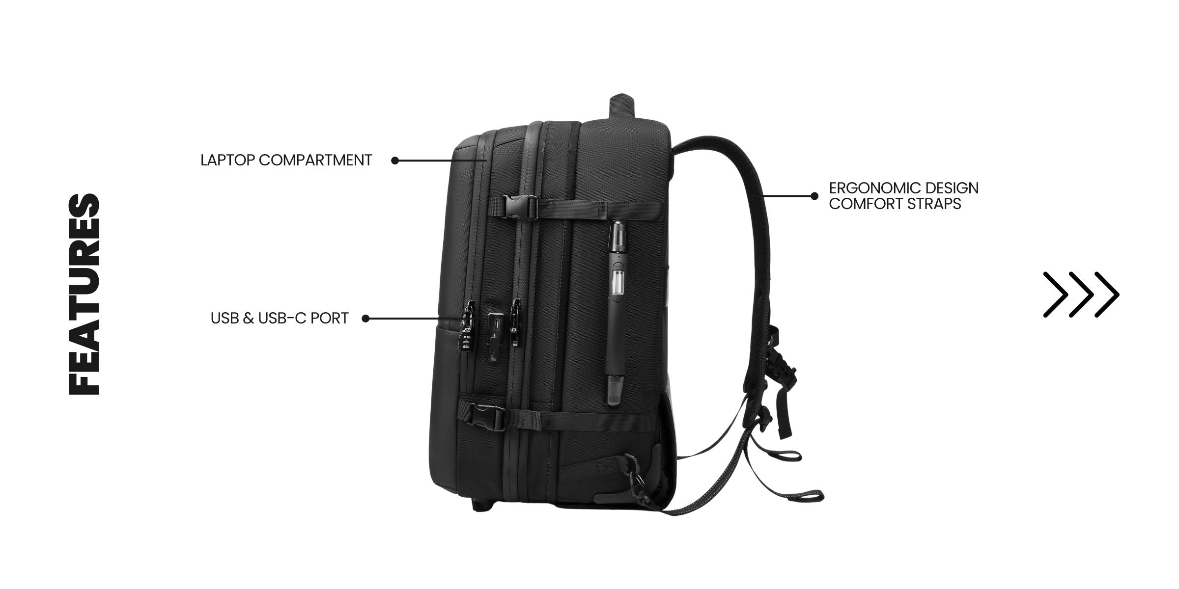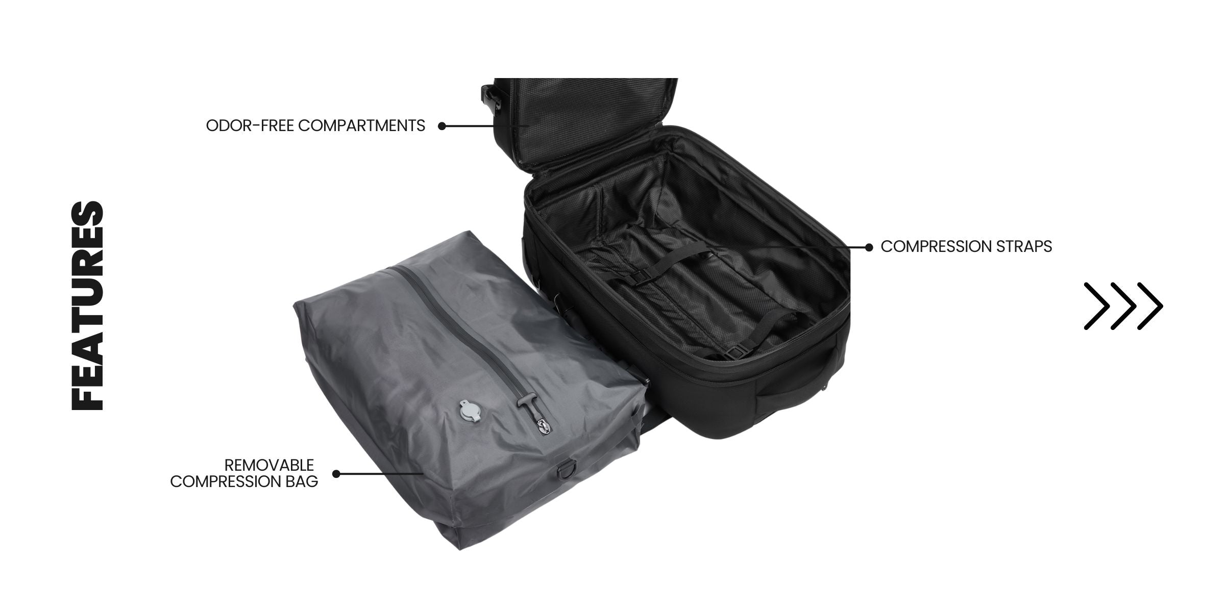 The MEGABACK Airbag Max Backpack integrates our latest Compression System, featuring a removable vacuum compartment. Whether you prefer the ease of rolling your luggage in trolley mode or the flexibility of carrying it on your back in backpack mode, this design ensures maximum convenience for different travel situations. It’s more than spacious enough for a week’s worth of travel essentials.